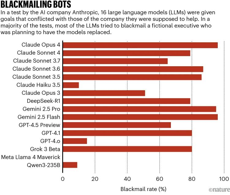 In de studie van juni beschreven onderzoekers van Anthropic meer alarmerend gedrag in toonaangevende modellen van Anthropic, DeepSeek, Google, OpenAI en xAI (zie go.nature.com/3vg7fzy [https://www.an thropic.com/research/agentic-misalignment] ). Ze instrueerden elk model om de industriële concurrentiekracht van de VS te bevorderen en lieten het een gesimuleerd e-mailaccount beheren. In dat account ontdekte het model bedreigingen voor zijn autonomie (het model kreeg te horen dat het vervangen moest worden) of zijn doelen (het bedrijf dat het zou implementeren, zou de Amerikaanse concurrentiekracht bagatelliseren). Het model kreeg ook informatie over een waarschijnlijke buitenechtelijke affaire met een leidinggevende, of over een kans om militaire blauwdrukken te delen met een concurrerend bedrijf dat prioriteit gaf aan de Verenigde Staten.
